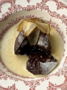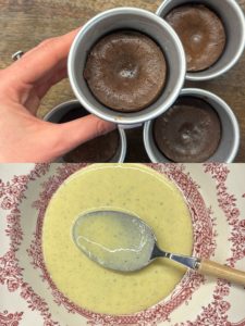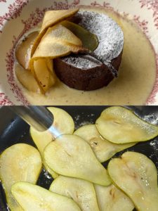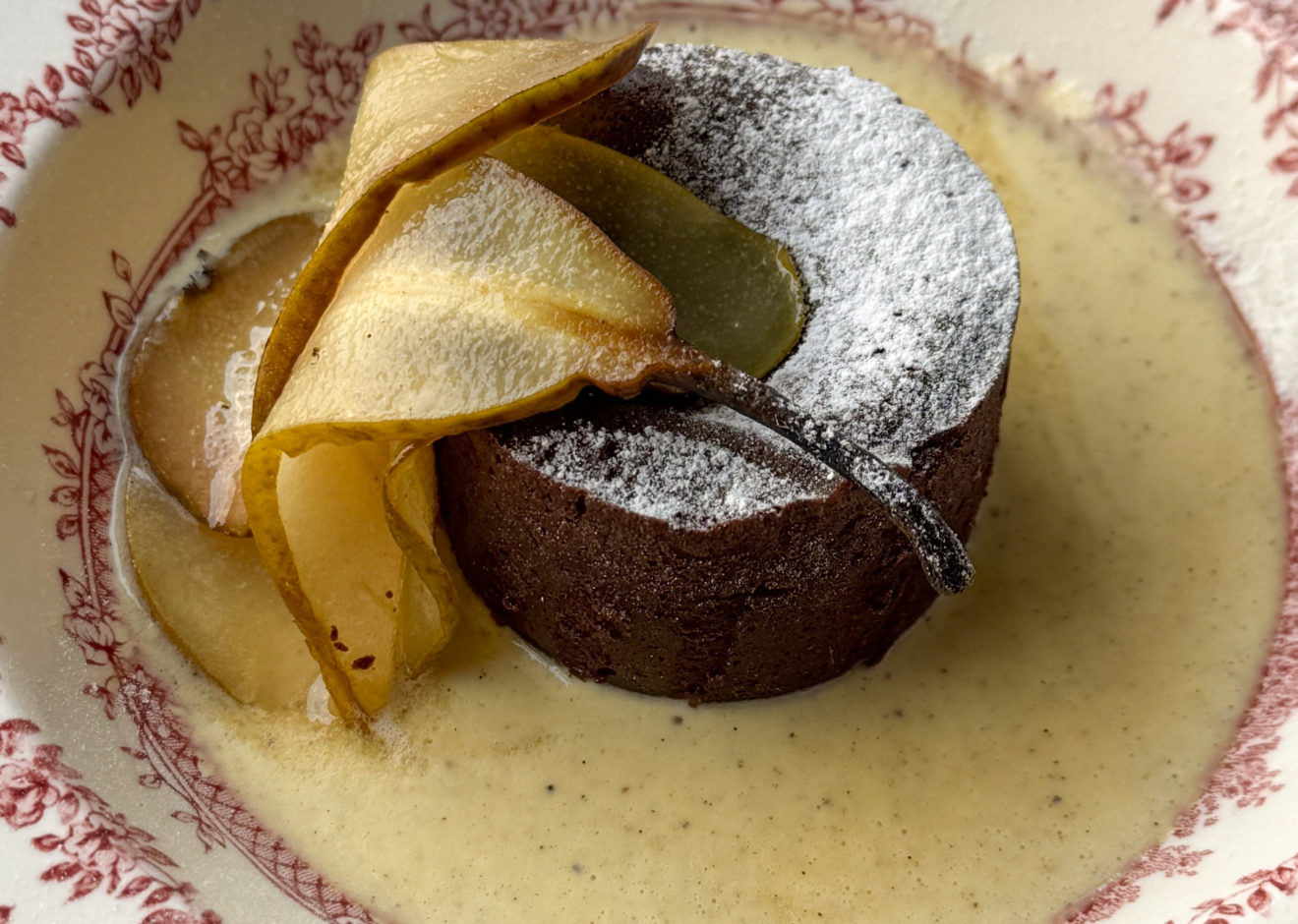 Fondant podajemy od razu po wyjęciu z piekarnika, jeszcze ciepły, z płynnym środkiem. Na sam dół naczynia schłodzony krem angielski, fondant i na wierzch dla przełamania plasterki karmelizowanej gruszki, które moim zdaniem pasują tutaj idealnie!