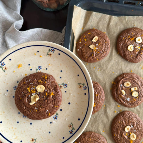 Lekko chrupiące z zewnątrz, wilgotne w środku, a do tego intensywnie czekoladowe – ciasteczka brownie, lecz w wyjątkowej odsłonie! Z dodatkiem orzechów laskowych, korzennych przypraw i skórki pomarańczowej. Składniki (około 8-11...